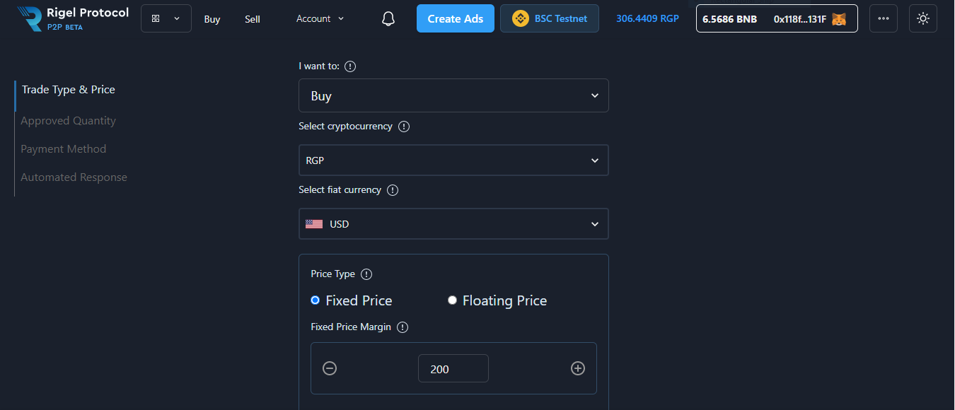 Step 2: Trade Type and Price - Fill in details for type of trade, Crypto you want to buy, the Fiat currency you want to buy the Crypto in, and set to Fixed Price or Floating Price.