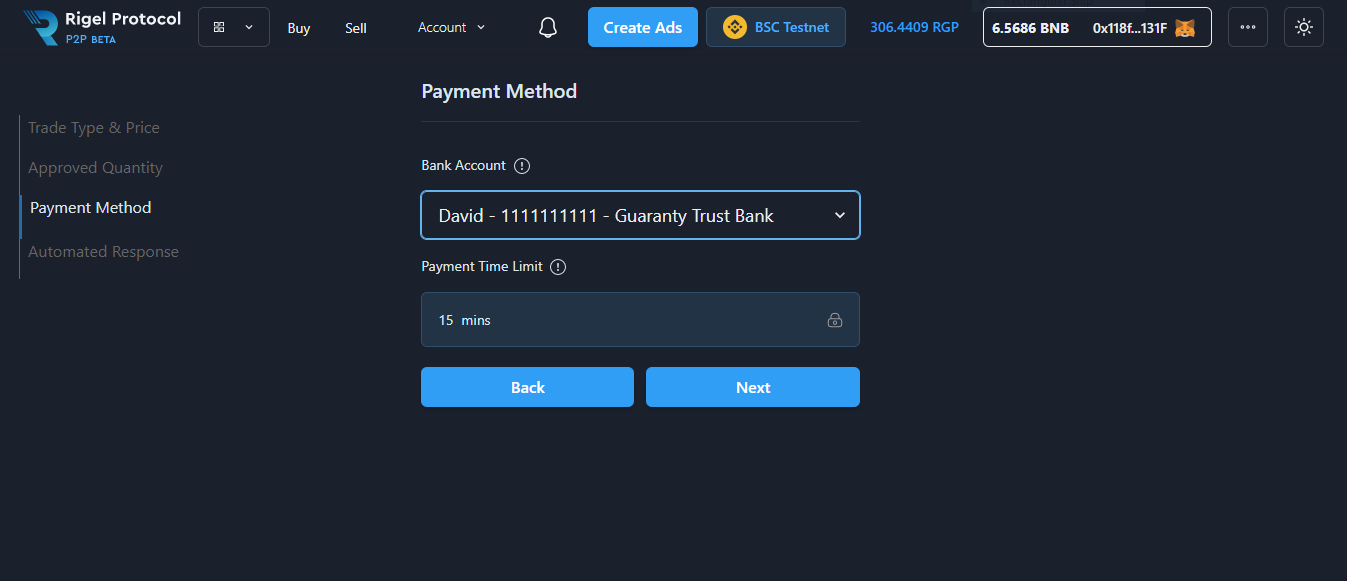 Step 4: Payment Method - Add bank account details and specify payment time limit, and click on "Next".