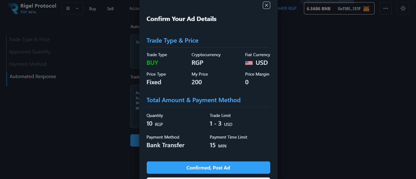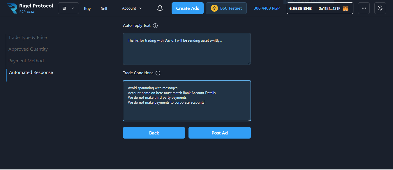 Step 5: Automated Response - Add specific details that will be displayed to users as "Automated Response" and "Trade conditions" when they engage your ad.